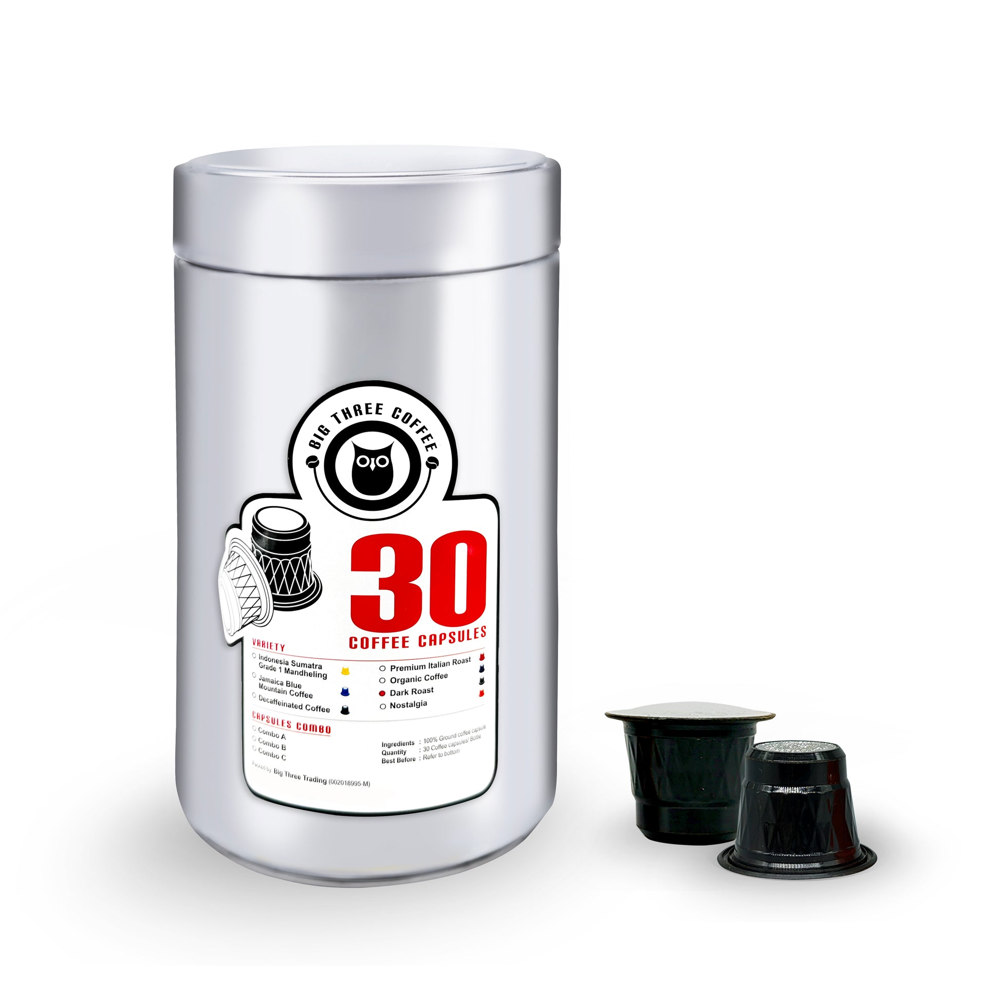 Big Three Coffee Capsules are freshly roasted espresso blends packed with nitrogen, preserving their freshness for up to two years. Each bottle contains 30 capsules and is compatible with Nespresso espresso machines, providing a convenient and high-quality espresso experience at home.